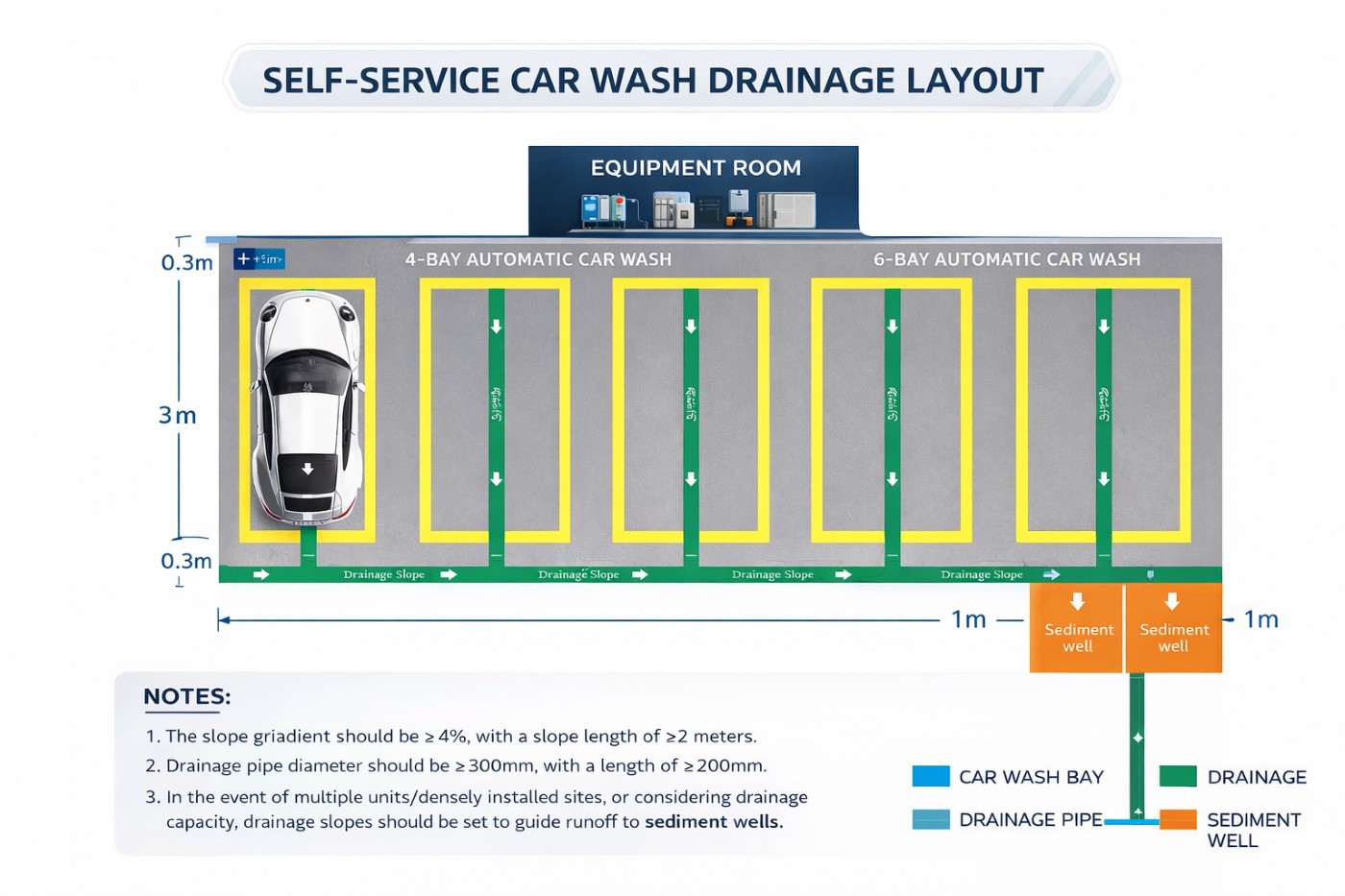 Diseño profesional de sistemas de drenaje para estaciones de lavado de coches de autoservicio, que garantiza un flujo de agua eficiente, una correcta separación de sedimentos y un funcionamiento estable a largo plazo.
